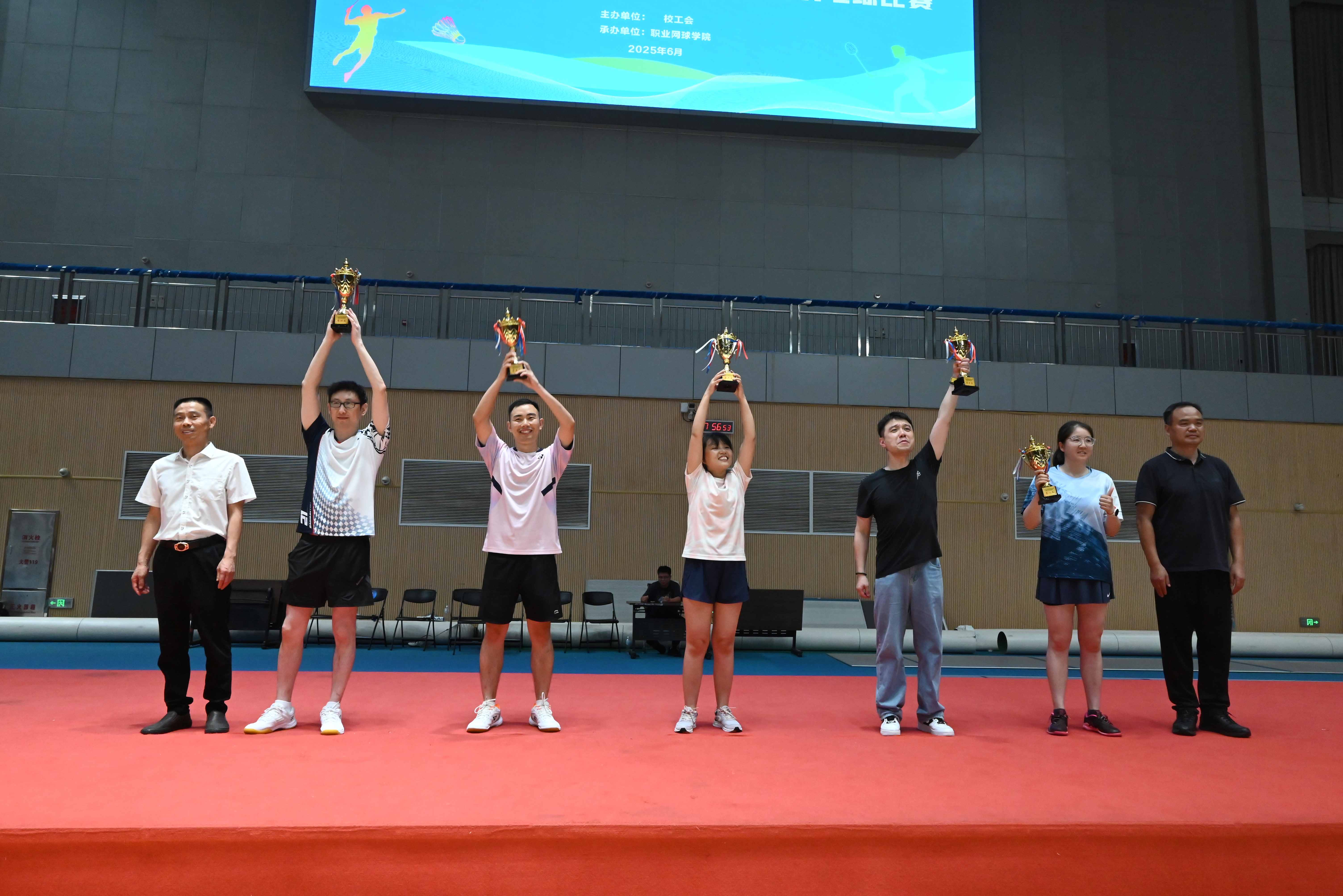 为期两周的2025年教职工羽毛球比赛于今日落幕,全校各分工会的15支代表队近300名教职工参赛。本次赛程共分两个阶段进行,比赛项目覆盖混合双打,女子双打,男子双打三个项目共七场。5月29日进行第一阶段比赛,经比拼产生八支代表队进入第二阶段比赛。